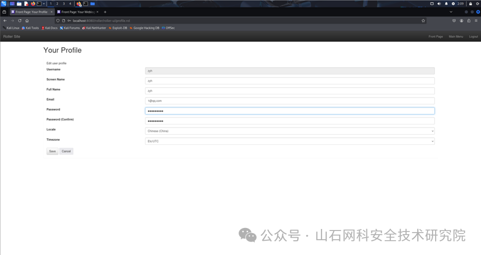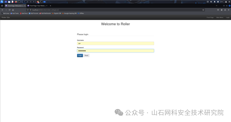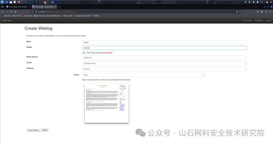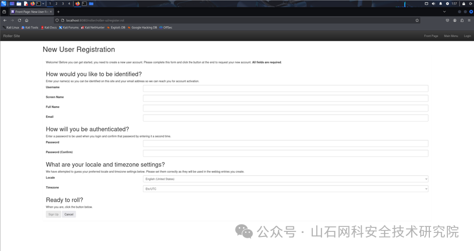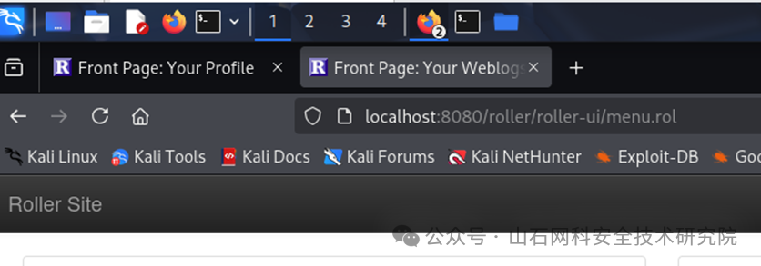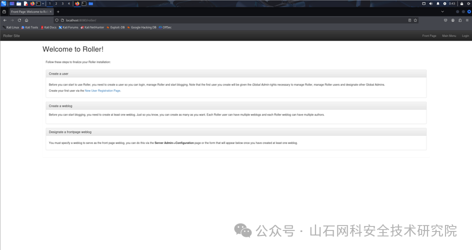 在docker中搭建apache roller 6.1.0相关环境,随后在火狐浏览器中输入localhost:8080/roller进入roller主页面,具体如图1所示: