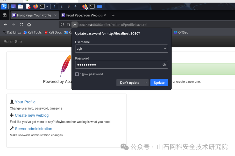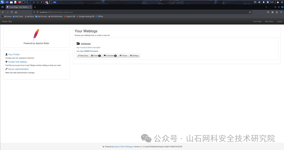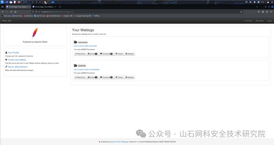5.创建完毕后,输入修改后的密码重新登录用户界面,发现新的weblog被创建,可以验证修改密码后,另一个页面的活动用户无法正确失效,仍然保持活动状态和可用。