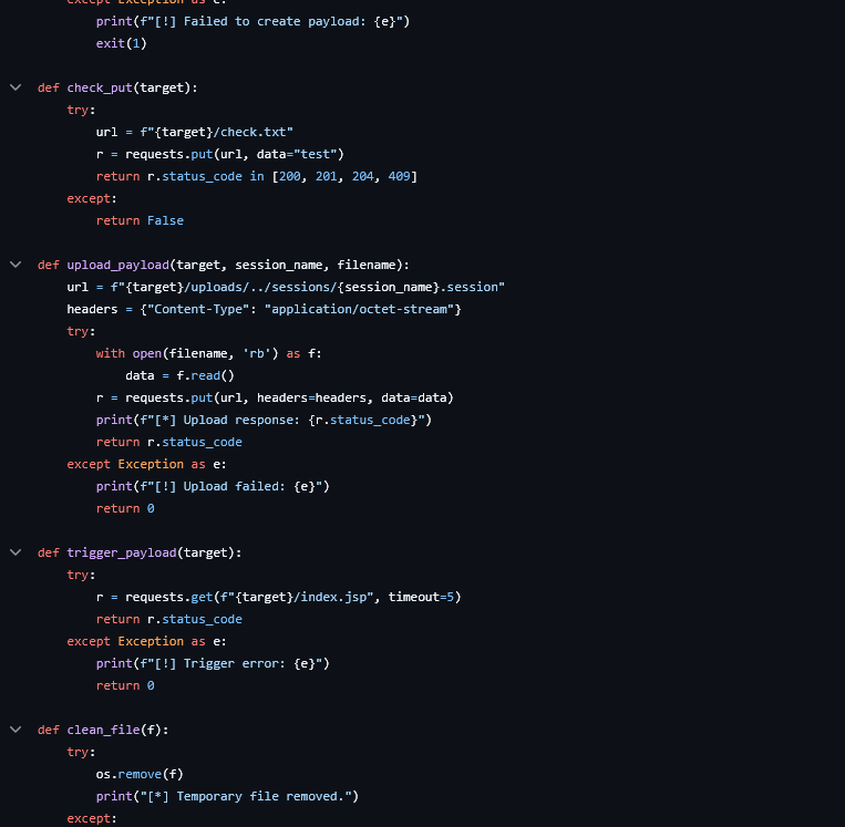 该漏洞利用代码包括通过 PUT 请求测试服务器可写性的功能,并自动生成用于有效负载交付的会话 ID。