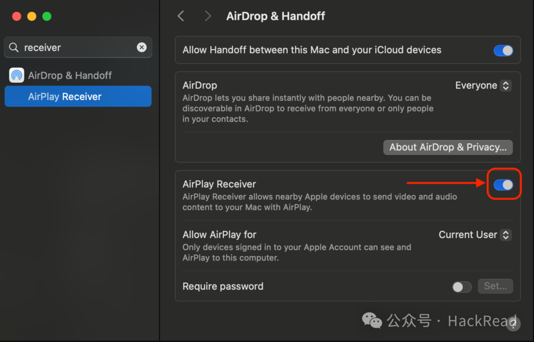 (用户交互绕过)组合使用时,攻击者可对与其处于同一网络中的 macOS 设备实现零点击 RCE,只要该设备开启了 AirPlay 接收器并设置为“同一网络中的任何人”或“所有人”。