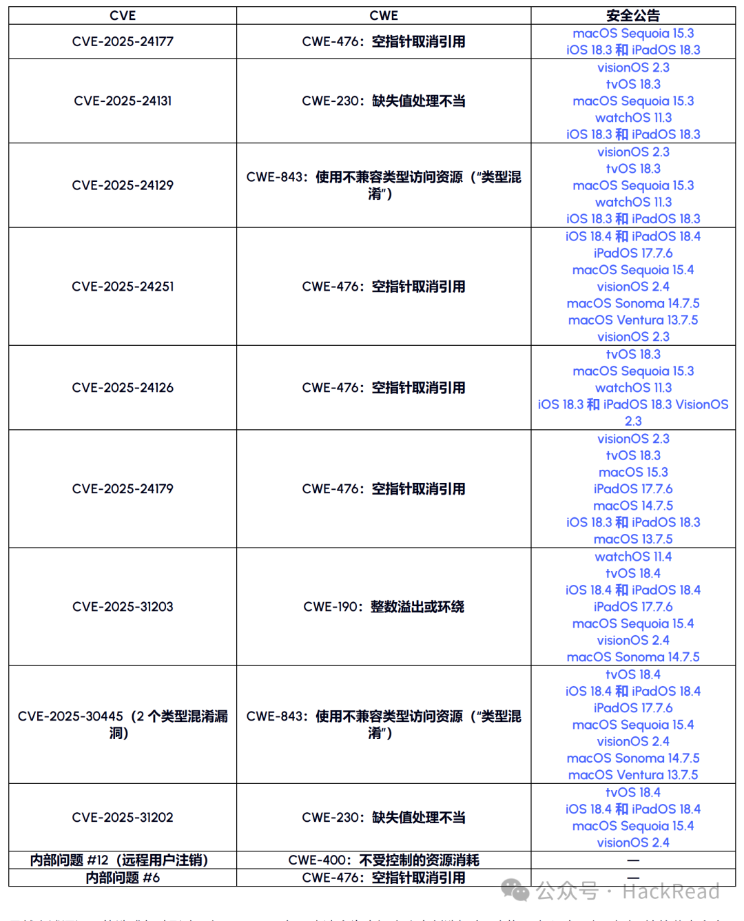 Oligo 共向 Apple 披露了 23 个漏洞,最终发布了 17 个 CVE 编号。完整的 CVE 列表及其所启用的攻击场景详见下文。