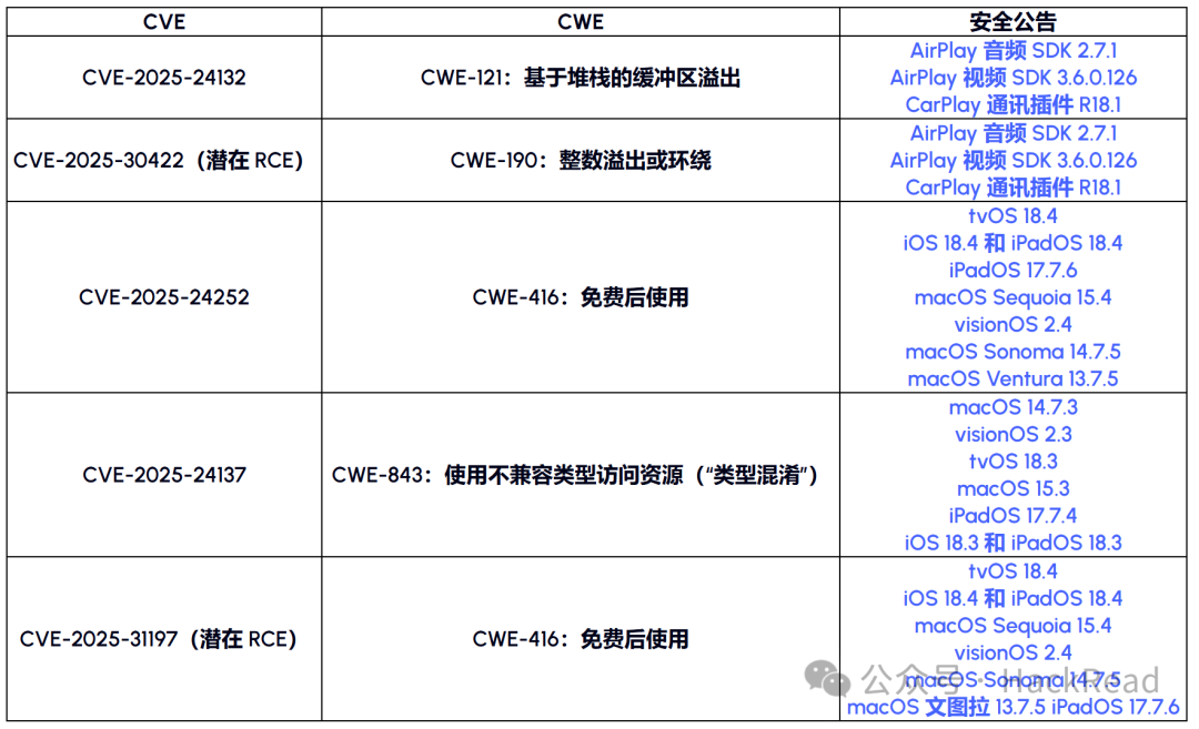 在某些情况下,Apple 会根据修复方式和修复时间将多个漏洞归类为同一个 CVE,而非按漏洞类型、影响范围或在 AirPlay 协议代码中的位置进行区分。