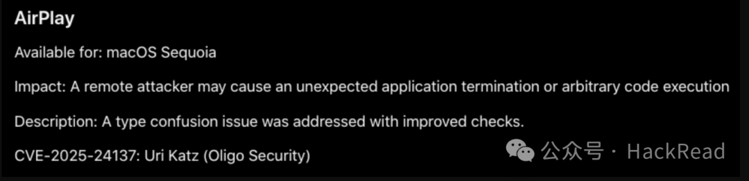 注意:CVE-2025-24137 已由 Apple 于 2025 年 1 月 27 日在 macOS Sequoia 15.3 中修复: