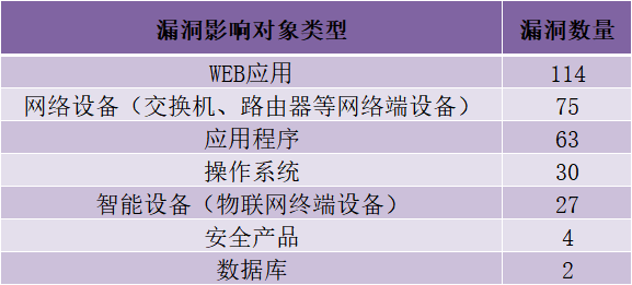 315个漏洞。WEB应用114个,网络设备(交换机、路由器等网络端设备)75个,应用程序63个,操作系统30个,智能设备(物联网终端设备)27个,安全产品4个,数据库2个