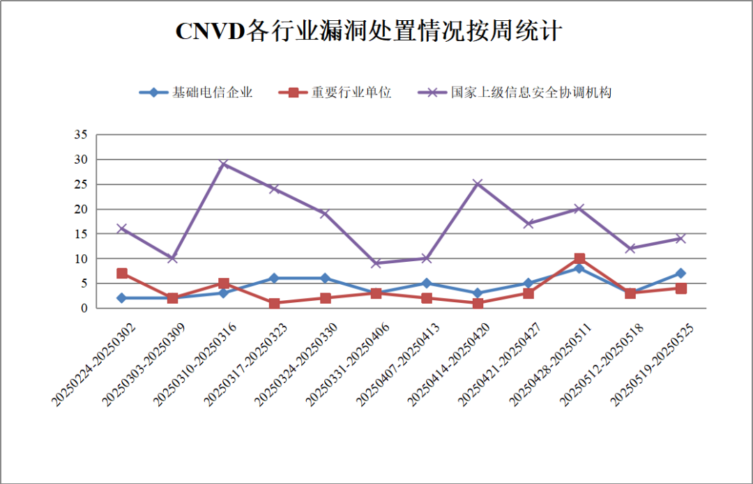 39个电信行业漏洞,7个移动互联网行业漏洞,19个工控行业漏洞(如下图所示)。其中,“Apache Tomcat输入验证错误漏洞(CNVD-2025-10031)、Huawei HarmonyOS和EMUI安全绕过漏洞(CNVD-2025-10512)、Triangle MicroWorks SCADA Data Gateway代码执行漏洞”