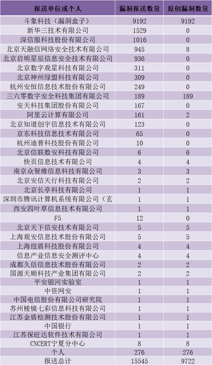 新华三技术有限公司、深信服科技股份有限公司、北京天融信网络安全技术有限公司、北京启明星辰信息安全技术有限公司、北京数字观星科技有限公司等单位报送公开收集的漏洞数量较多。北京天下信安技术有限公司、上海观安信息技术股份有限公司、上海纽盾科技股份有限公司、信息产业信息安全测评中心、成都久信信息技术股份有限公司、国源天顺科技产业集团有限公司、平安银河实验室、中资网安、中国电信股份有限公司研究院、苏州棱镜七彩信息科技有限公司、江苏金盾检测技术股份有限公司、中国银行、江苏保旺达软件技术有限公司及其他个人白帽子向CNVD提交了9722个以事件型漏洞为主的原创漏洞,其中包括斗象科技(漏洞盒子)和三六零数字安全科技集团有限公司向CNVD共享的白帽子报送9381条原创漏洞信息