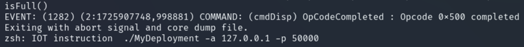 sigabort是在断言失败时发送信号并强制终止进程。因此,由于过多的命令传输导致队列溢出,引起断言失败,最终导致飞行软件进程异常终止的拒绝服务(DoS)情况。