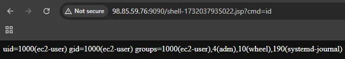 上传 Java Web Shell 后,用户可以通过访问该 Web Shell 来远程执行命令。下图显示了执行“id”命令的结果。