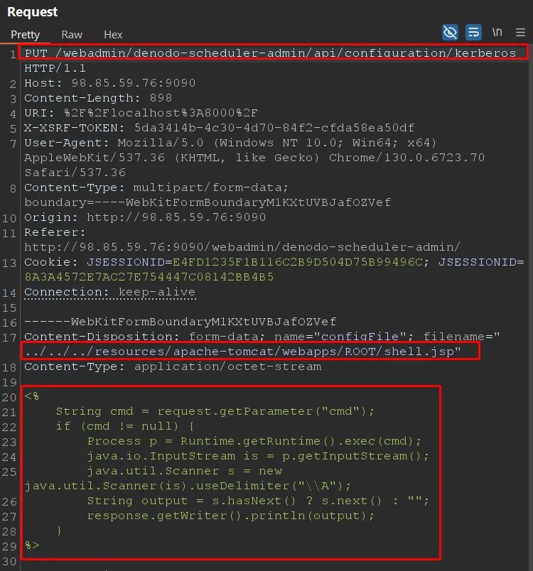 通过操纵引用带有“点-点-斜杠 (../)”序列及其变体的文件的变量,或使用绝对文件路径,攻击者可能能够访问存储在文件系统中的任意文件和目录。具体来说,对于 CVE-2025-26147 漏洞,Kerberos“Keytab”文件上传请求中的有效载荷允许恶意用户将文件上传到服务器文件系统中的(几乎)任何位置: