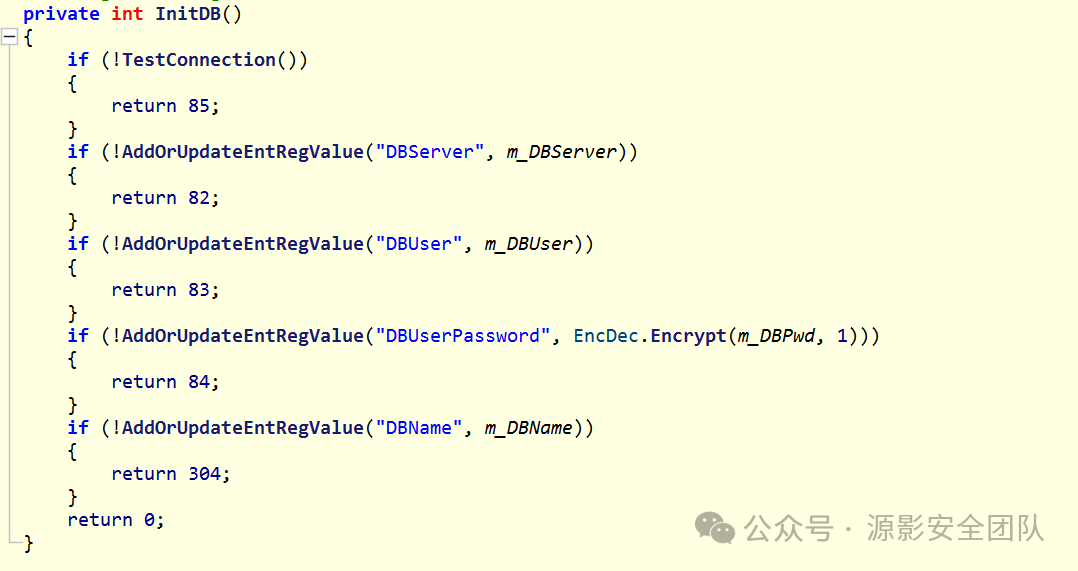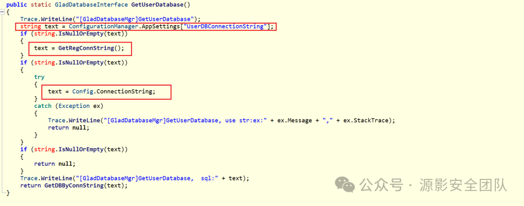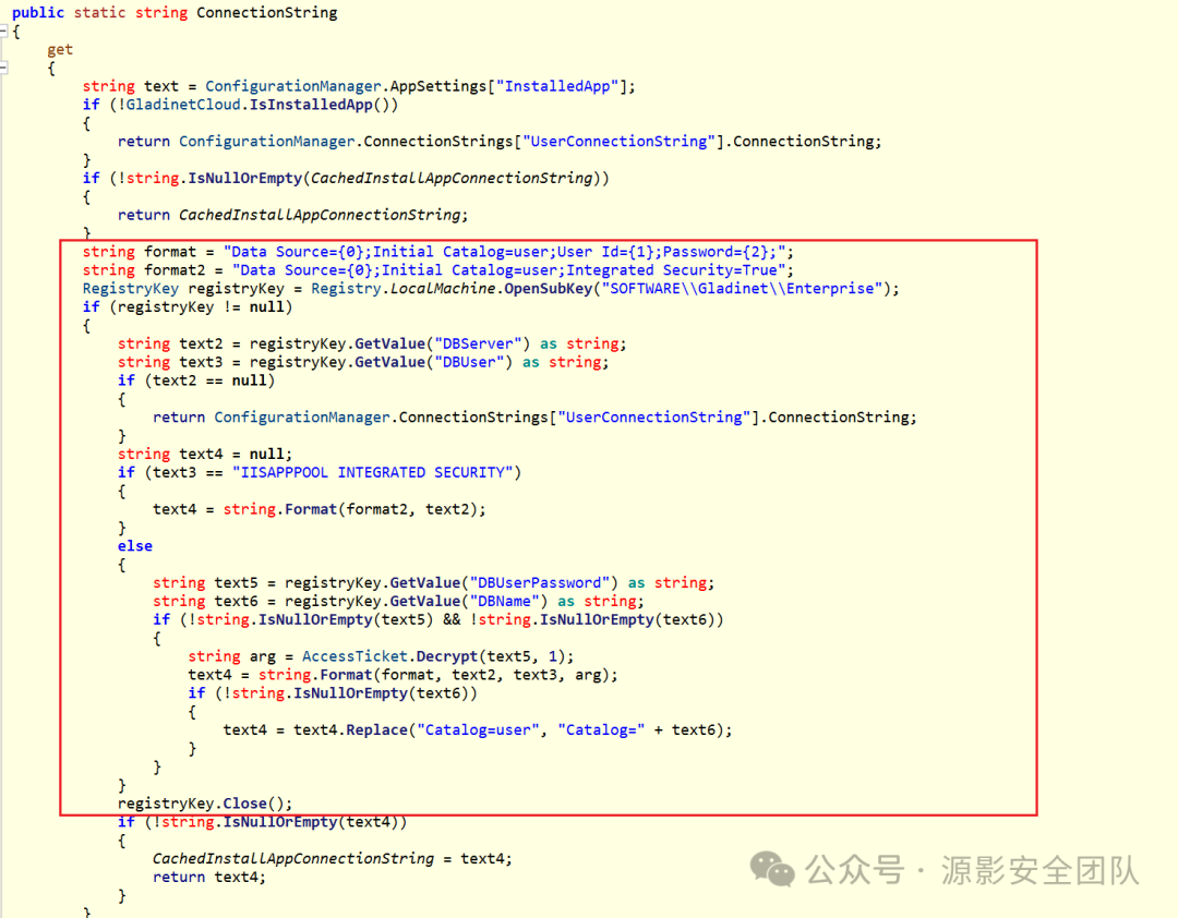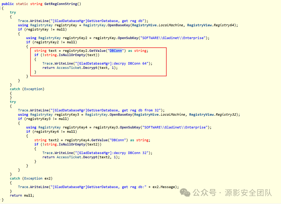 主要关注 GetRegConnString() 和 Config.ConnectionString 可以和上面获取数据库信息的逻辑对上: