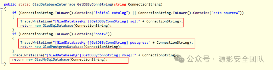 随后连接字符串给传入 GetDBByConnString,根据其特征分别是 3 种不同的数据库:sql server、postgres、mysql