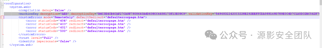 加密和签名序列化数据所用的算法和密钥存放在 web.config 。该漏洞就是由于 web.config 中配置的算法和密钥是固定的,我们可以本地搭建环境获取其密钥然后构造反序列化 Payload。