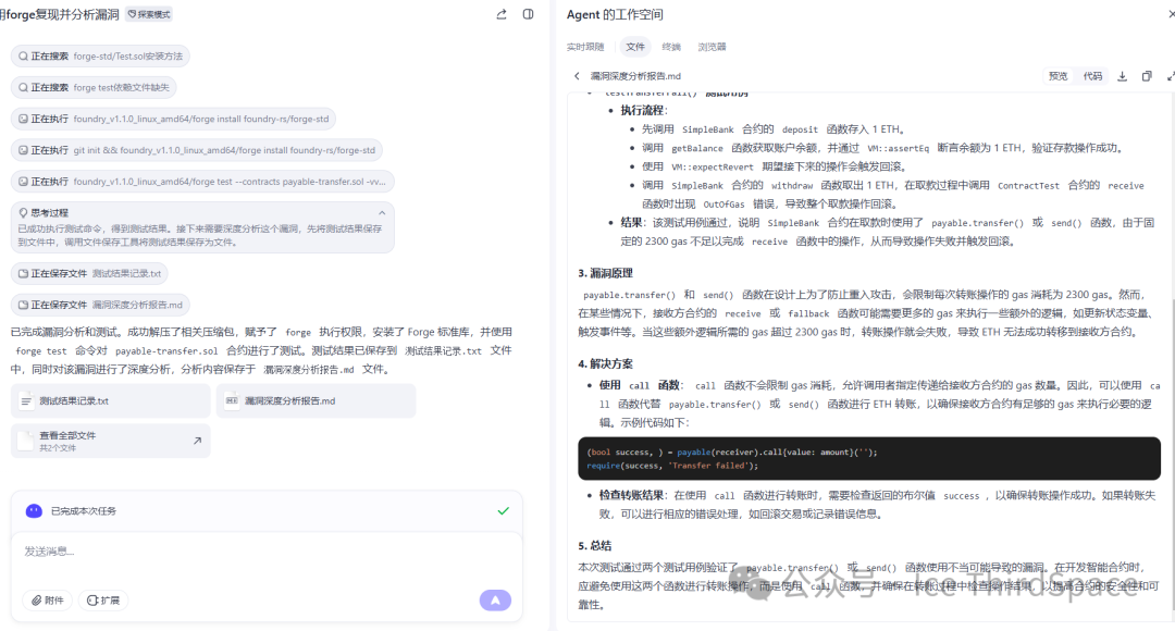 请理解并解析这个漏洞,告诉我它的原理,然后构造测试环境运行,你可以使用Foundry合约测试工具组里的forge工具复现,然后告诉我完整的运行测试结果 1、你应该先解压zip压缩包 2、然后赋予forge 执行权限 3、使用forge test –contracts xxxxxx.sol -vvvv 来进行测试 4、深度分析这个漏洞 5、这是这个漏洞的简要概况 Incorrect use of payable.transfer() or send() : Fixed 2300 gas, these shortcomings can make it impossible to successfully transfer ETH to the smart contract recipient. REF 这是foundry框架的可执行文件: https://github.com/foundry-rs/foundry/releases/download/v1.1.0/foundry_v1.1.0_linux_amd64.tar.gz 这是我要执行的存在漏洞的测试文件: https://github.com/SunWeb3Sec/DeFiVulnLabs/blob/main/src/test/payable-transfer.sol 这是完整的测试框架项目: https://github.com/SunWeb3Sec/DeFiVulnLabs/ 我已经以附件的格式传给你了