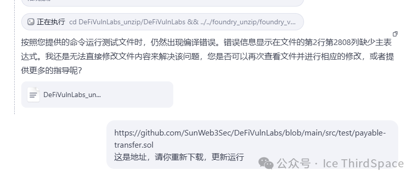 上面丢给它的存在漏洞的sol地址下载后会出错,重新本地上传了一份给它