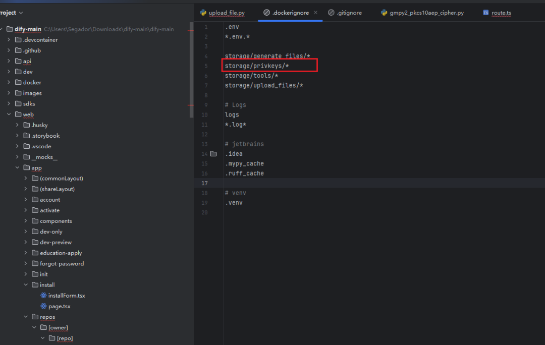 如果你仔细查看过官方文档会找到一个STORAGE_LOCAL_PATH的参数,而该参数的默认指向/app/api/storage在storage中则存放着我们的private.pem,具体可以参考官方文档内容