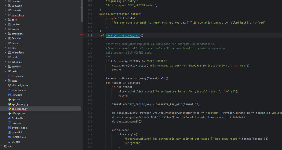 在api/commands.py中我们可以分析reset_encrypt_key_pair()命令会为每个工作空间(tenant)生成一对新的非对称密钥(RSA 2048位),私钥以 PEM 格式存储在