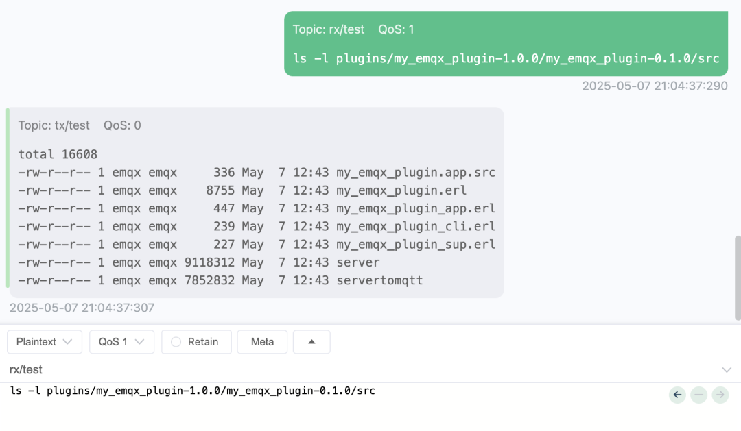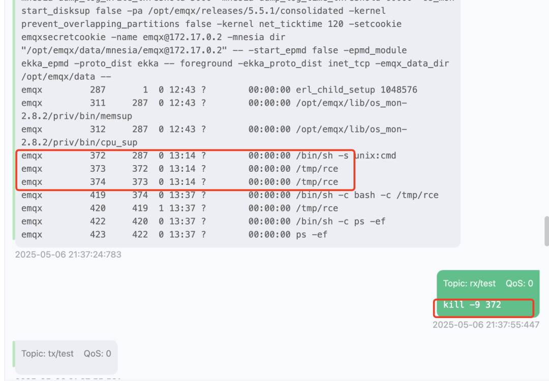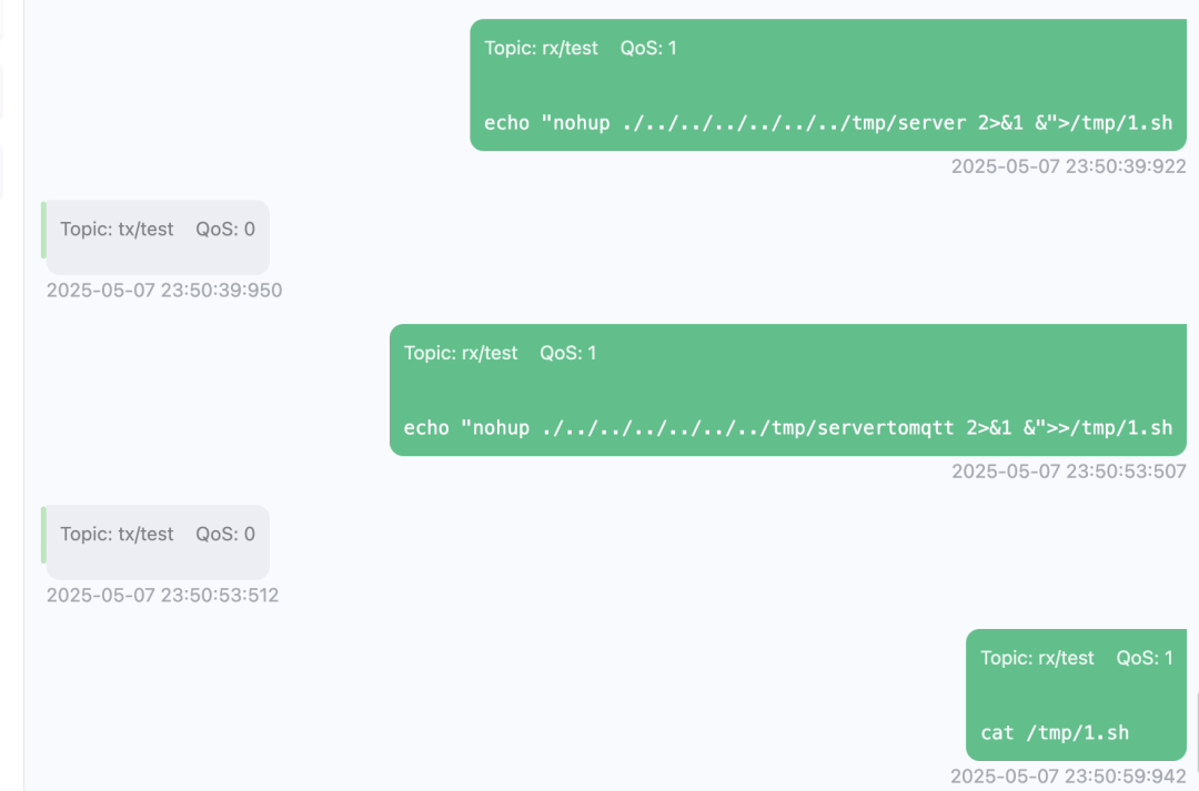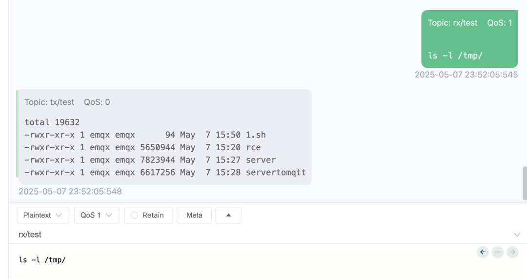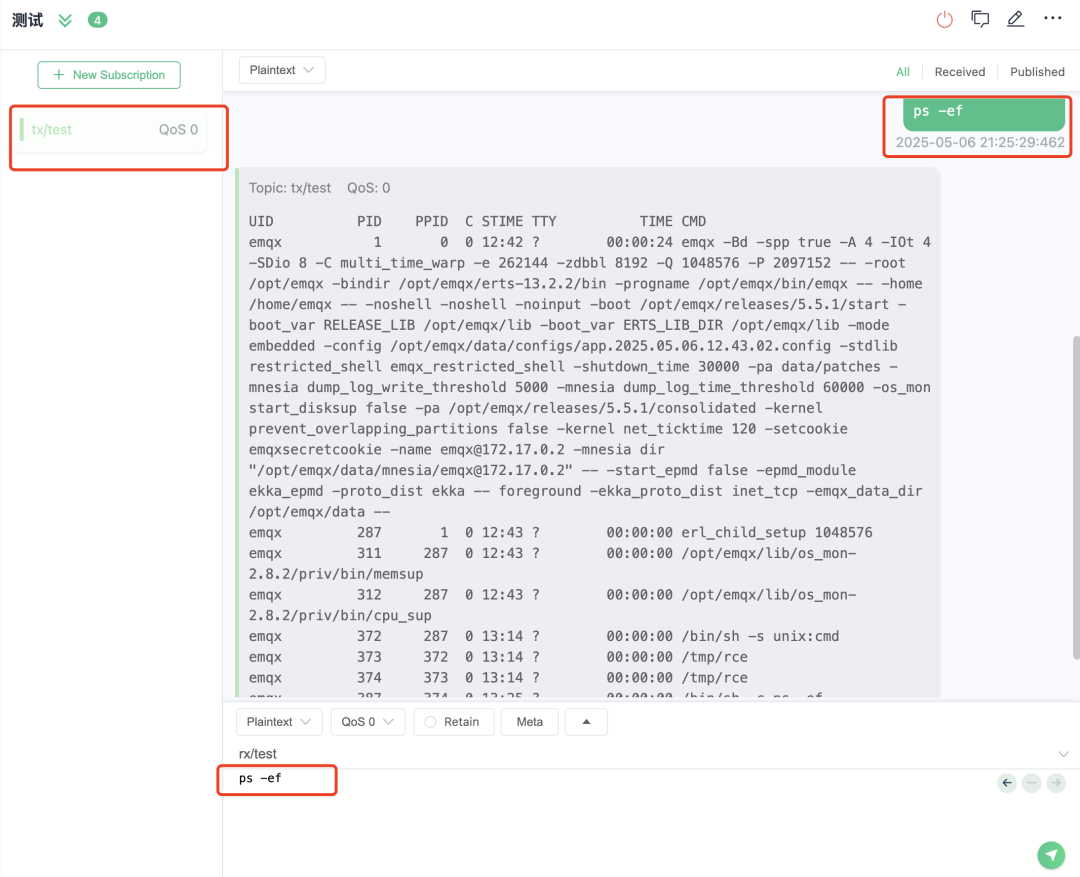 rce执行程序发布一个tx/test主题,订阅rx/test主题。mqttx则要相反,订阅tx/test主题,发布rx/test主题。