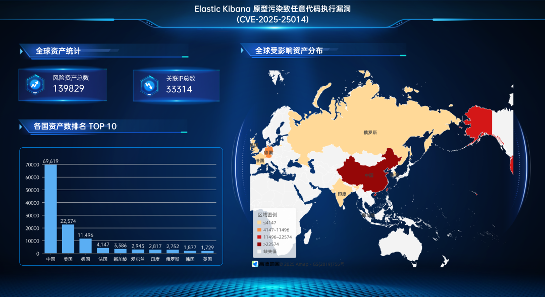 关联的全球风险资产总数为139829个,关联IP总数为33314个。全球风险资产分布情况如下: