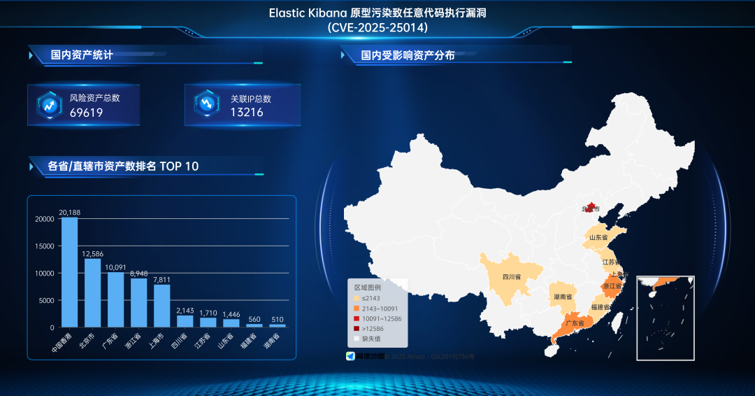 关联的国内风险资产总数为69619个,关联IP总数为13216个。国内