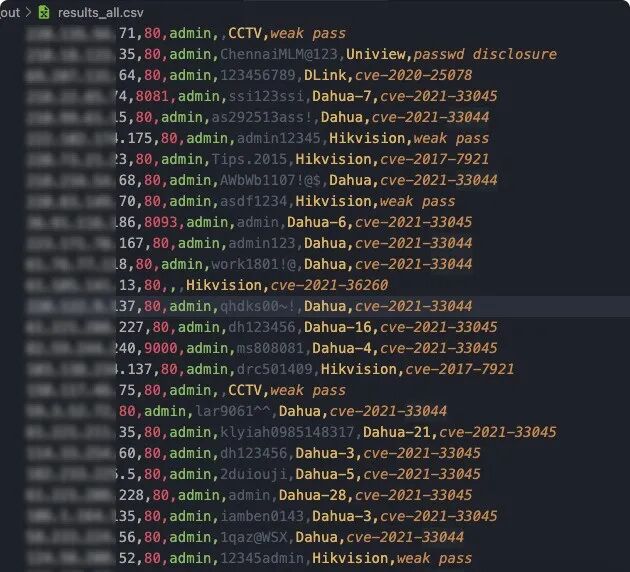 另外,为了提高扫描速度,还可以利用端口扫描器先获取活动主机,缩小 Ingram 的扫描范围。就拿 masscan 来说,先用它扫描特定端口存活的主机,把结果整理成 ip:port 的格式,再作为 Ingram 的输入。扫描完成后,结果会保存成不同的文件,其中 results.csv 里保存了完整的结果,包括 IP、端口、设备类型、用户名、密码、漏洞条目这些信息。