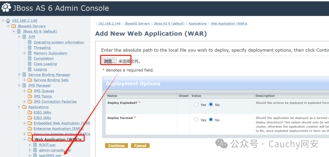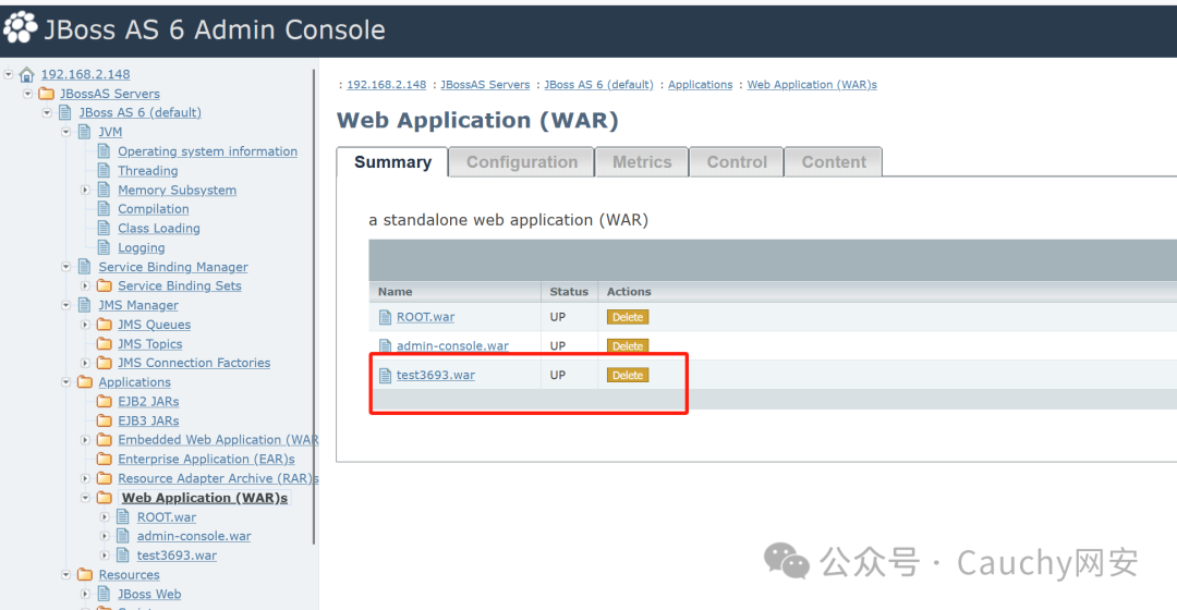 在控制台中找到web application(war)s –add a new resource–选择war文件上传–访问http://192.168.2.148:8080/test3693