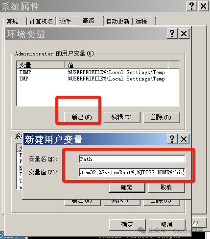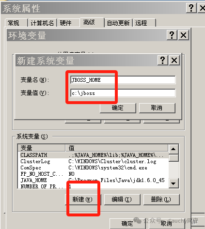 新建系统变量:变量名:JBOSS_HOME 变量值:C:\jboss变量名:SystemRoot 变量值:C:\windows新建用户变量:变量名为:Path 变量值:%SystemRoot%/system32;%SystemRoot%;%JBOSS_HOME%\bin
