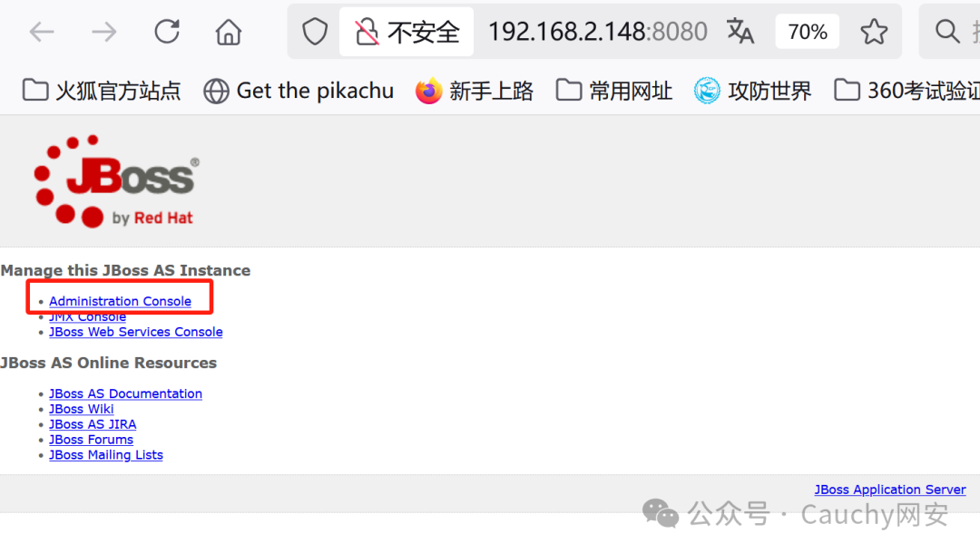 然后通过问一下 jboss 网址,http://192.168.2.148:8080 ,注意,一定要输入 http://才行,jboss 默认端口时 8080,(如IIS 中有网站端口冲突,记得修改)我们在浏览器输入如下网址,查看效果。(注意先不要启动jspstudy2016,否则会打不开这个 Jboss 控制台!!防止端口冲突)