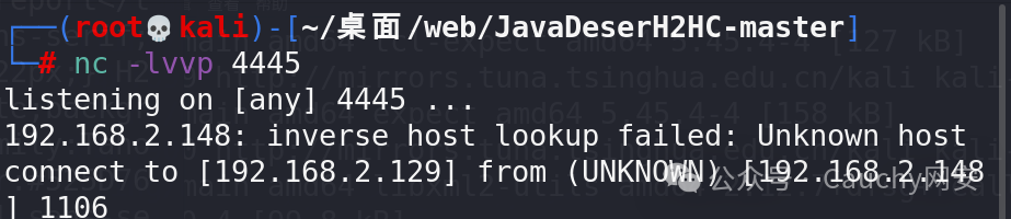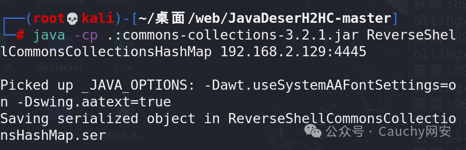 启动 ReverseShellCommonsCollectionsHashMap 程序,运行时能访问当前目录和 commons-collections-3.2.1.jar 中的类,192.168.2.129:4445(是kali监听的ip地址)的反弹shell用来做远程连接或其他网络操作。