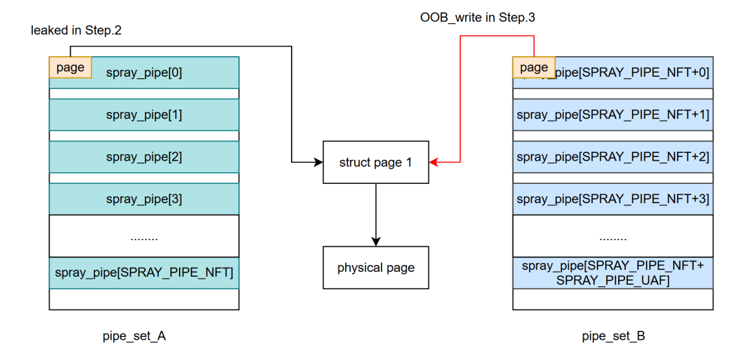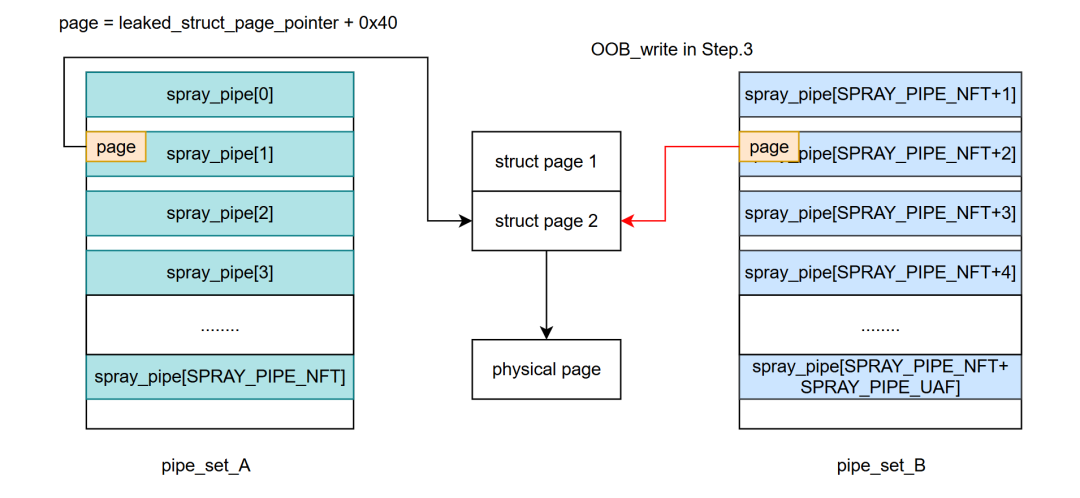 ,同时去触发越界写,在检测是否成功溢出到 page 指针。在这个过程中堆喷的pipe_buffer称作