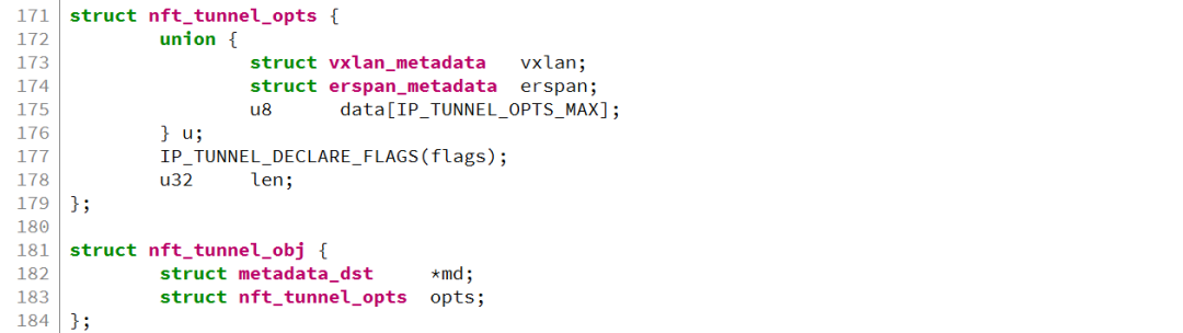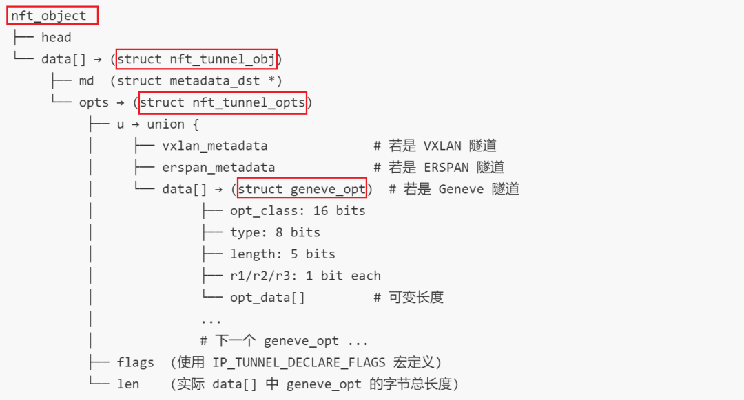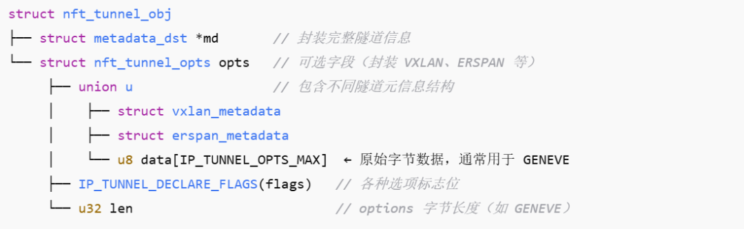 是 Linux 内核中 Netfilter 子系统的一部分,用于描述隧道封装元数据(如 VXLAN、ERSPAN、GENEVE 等)并与 Netfilter 的对象机制结合,从而在
