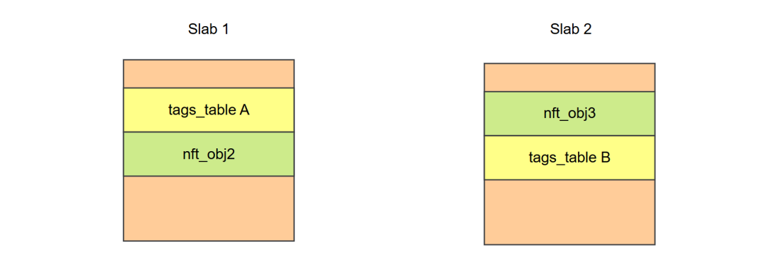 释放obj1,喷射tags_table A,释放obj4,喷射tags_table B,此时堆分布如下: