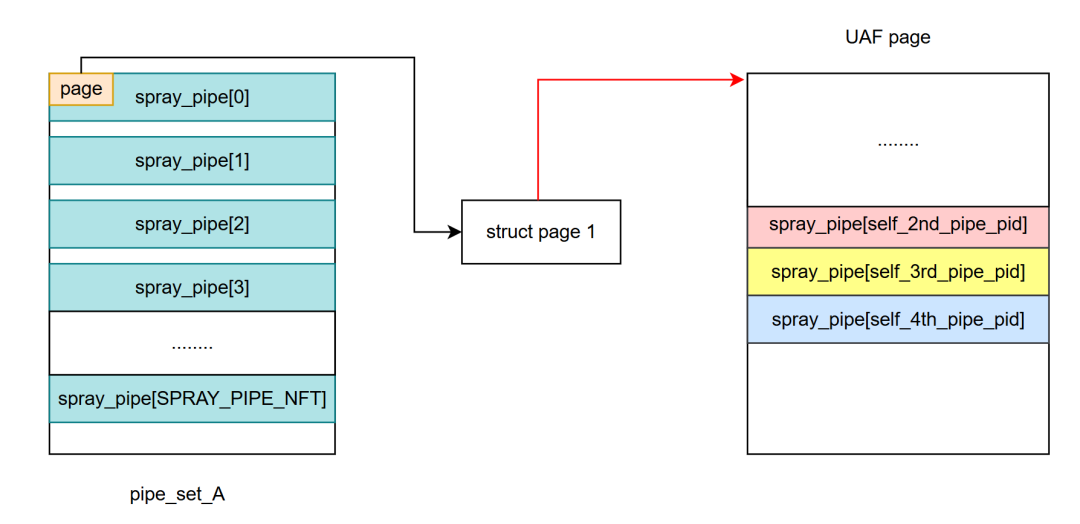 在泄露出 page 之后,利用方式就变得比较多了,这里通过越界写构造一个 Page UAF,构建自写管道,实现任意物理地址读写,由于堆块分配的随机性,所以在这个过程中需要堆喷