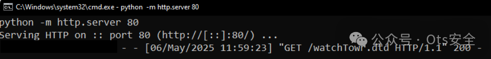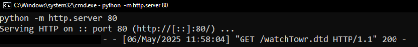 我们迅速返回一个带有空白响应的 HTTP 200,并立即尝试/watchTowr.dtd从攻击者控制的服务器获取: