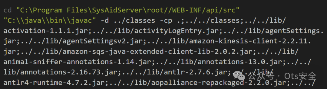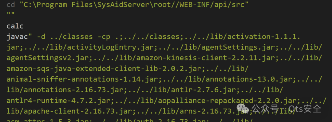 如您所见,C:\java\bin\是当前 Java 路径,文件的其余部分包含多个 shell 命令,这些命令执行 Java 代码以最终生成有关当前 SysAid 实例的 API 信息。