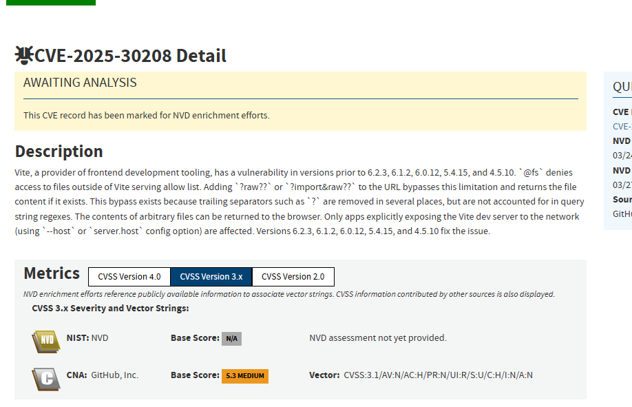 CVE-2025-30208 是 Vite 开发服务器(Dev Server)中曝出的超危漏洞(CVSS 评分9.8),允许攻击者通过构造特殊 URL 参数,绕过文件访问限制,直接读取服务器任意文件(如 /etc/passwd、/tmp/secret.txt 等),导致敏感信息泄露。