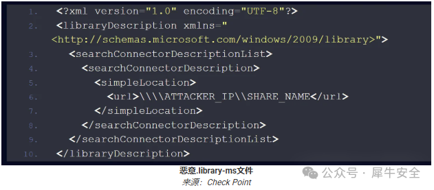 在后续的攻击活动中,Check Point 发现了包含 .library-ms 附件(不含存档)的网络钓鱼邮件。只需下载 .library-ms 文件即可触发远程服务器的 NTLM 身份验证,这表明无需存档即可利用此漏洞。