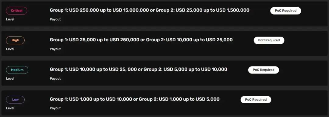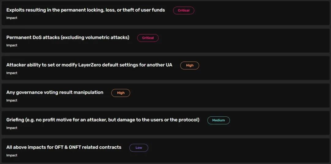 对于涉及 LayerZero 支持的所有其他区块链的第 2 组,关键发现的最高支付额为 1,500,000 美元,高严重性缺陷为 25,000 美元,中度缺陷为 10,000 美元,低影响缺陷为 5,000 美元。