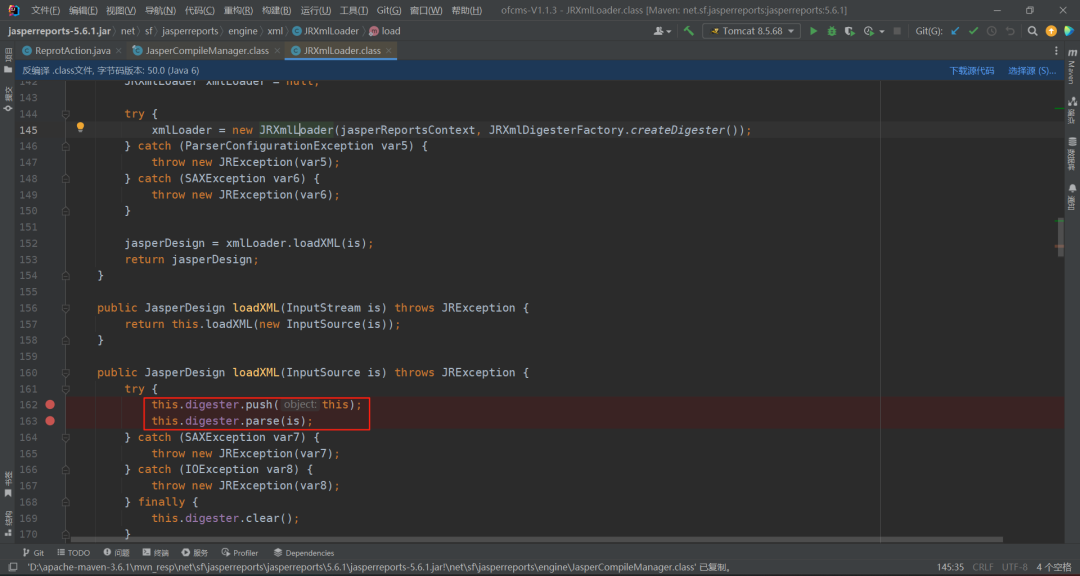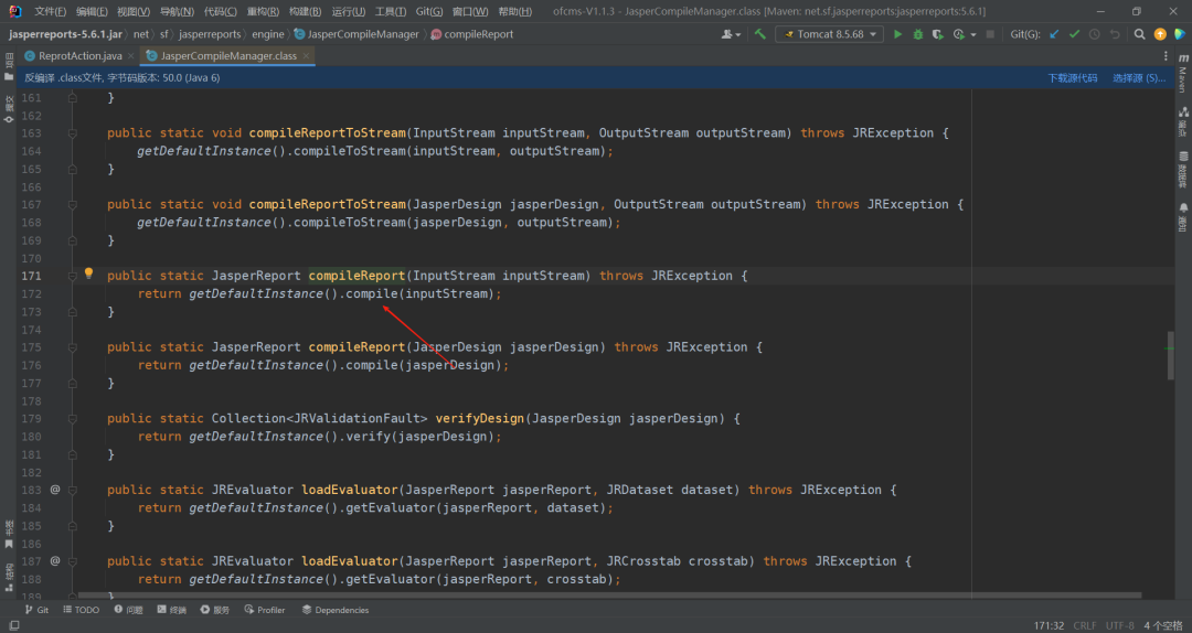 继续跟进,来到D:\apache-maven-3.6.1\mvn_resp\net\sf\jasperreports\jasperreports\5.6.1\jasperreports-5.6.1.jar!\net\sf\jasperreports\engine\JasperCompileManager.class