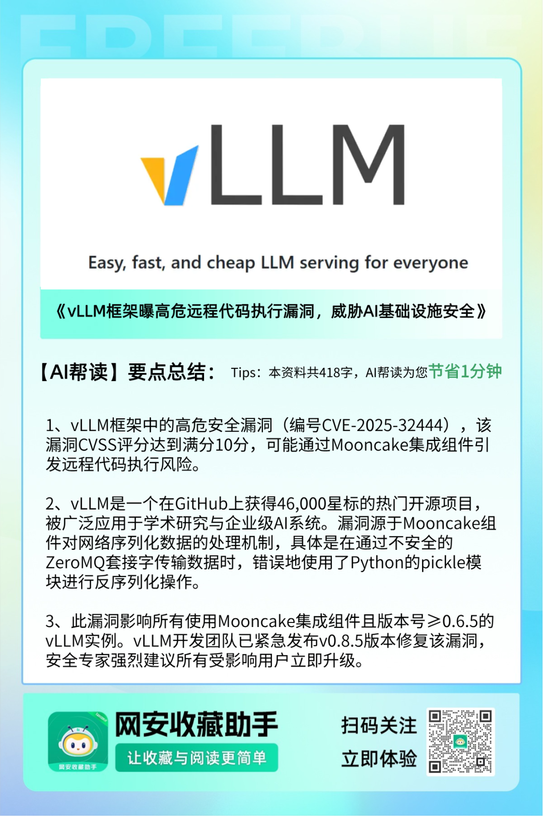此漏洞影响所有使用Mooncake集成组件且版本号≥0.6.5的vLLM实例。需要特别说明的是,若vLLM部署未启用Mooncake组件进行分布式键值传输,则不受此特定漏洞影响。