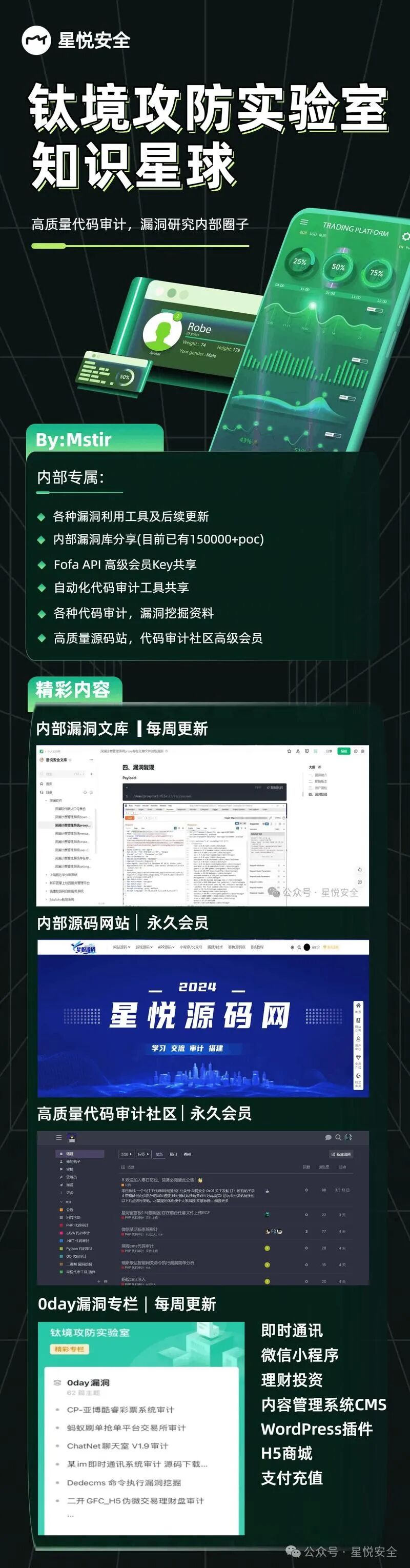 高质量漏洞利用研究,代码审计圈子,每周至少更新三个0Day/Nday及对应漏洞的批量利用工具,团队内部POC,源码分享,星球不定时更新内外网攻防渗透技巧以及最新学习,SRC研究报告等。