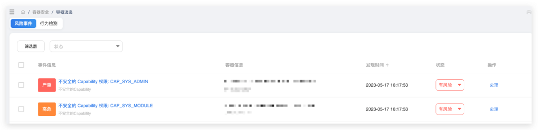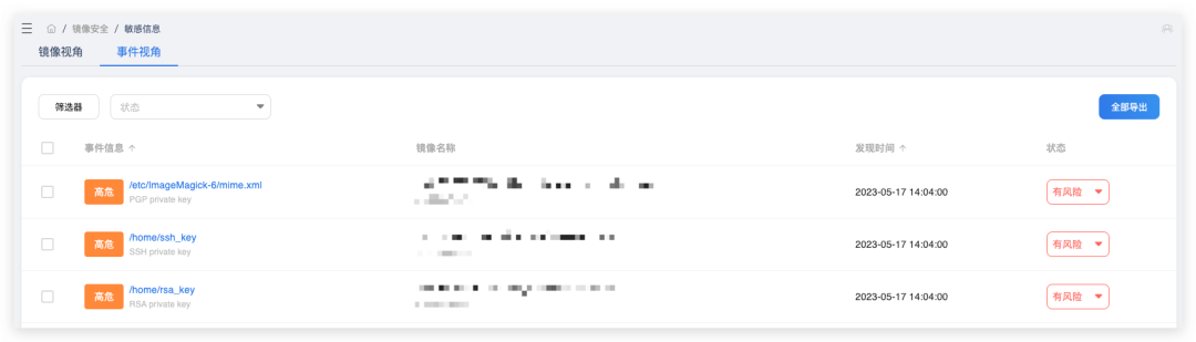 事前防护:对镜像资产/容器资产进行扫描,保证镜像/容器内没有敏感信息以及过高的凭证信息。