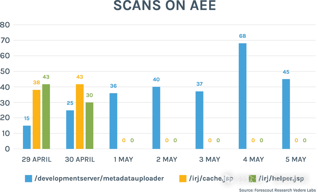自 4 月 25 日(CVE 发布后的第二天)以来,已有多种扫描工具和概念验证 (PoC) 漏洞被公开。如下图所示,我们从 4 月 29 日开始注意到针对 AEE 的扫描。针对“/developmentserver/metadatauploader