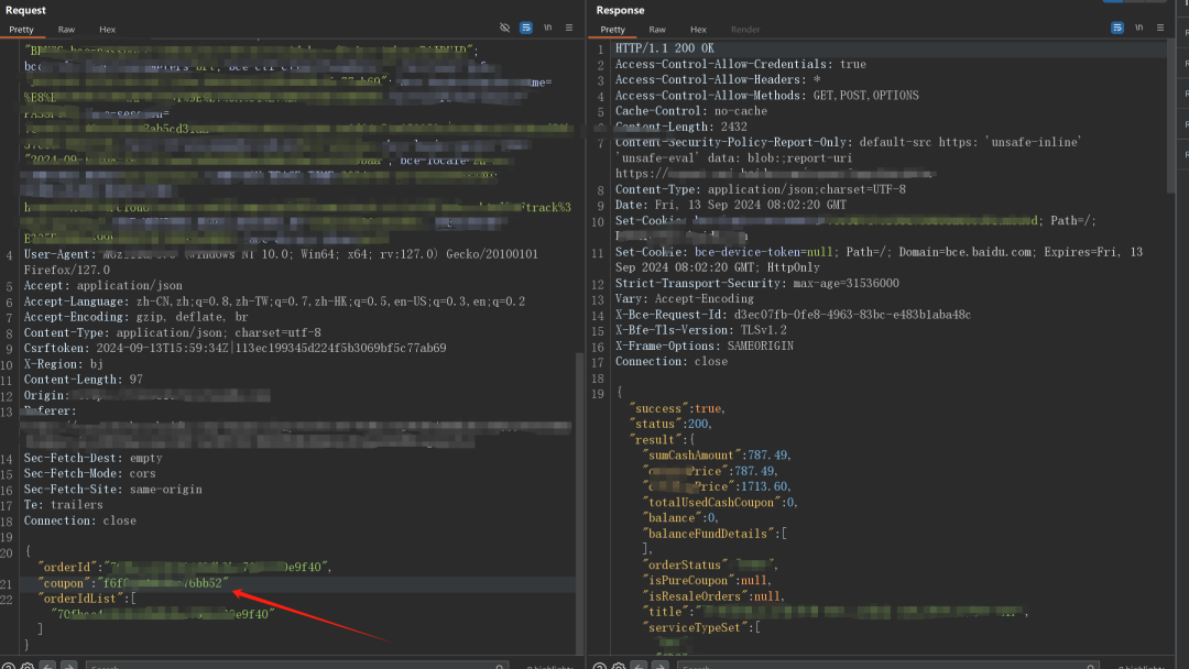 如果经常使用优惠券的兄弟们会发现,每次优惠券的特定id号都是不一样的,就算是同一个额度或类型的优惠券,每个账户领取的优惠券在数据包中id都是不一样的,这时候我们可以想到:我们自己账户1没有优惠券,但我们还是想用优惠券,这时候我们就可以尝试找一个有优惠券的账号2,进行抓包,然后获取到优惠券的id号,在账户1中进行购买的时候,发现在数据包中优惠券的参数是类似:”couponCode”:”null”或者在购买的数据包里的json数据没有优惠券的参数,我们可以自己尝试加优惠券的参数然后将值替换成我们抓到账号2的优惠券id号,最后成功在支付页面金额达到优惠!并且可能会发现账号2的优惠券并没有被使用掉,可能是开发只是简单的处理对最后金额=单价-优惠券,这样子危害性就非常大!那么我们还可以有另一个想法,如果优惠券的id号有规律,那我们岂不是可以爆破比如最后四位,我们只要查看返回包的金额是否变化即可知道是否有优惠券,只不过这样子的话工作量会非常大不知道是否会有大额优惠。
