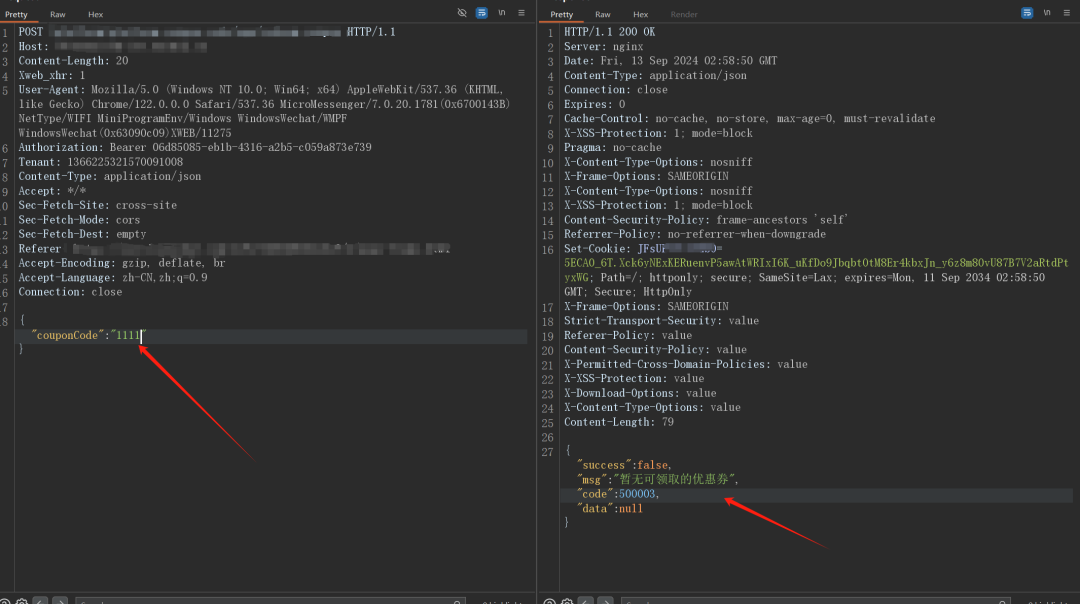 尝试无法并发领取优惠券的时候,却发现数据包中有对应优惠券的参数,通常逻辑是你点击领取优惠券或者输入优惠券的优惠券号就给你兑换对应号码的优惠券,不同的数字号码对应的优惠券额度也不同,但是有时候出于某种原因,商家在节假日活动会上架一些大额的优惠券,只能前几个人领取,兑换按钮就灰色了无法领取了,但是如果我们遇到非常简单的比如四位数字的优惠券id我们就可以尝试进行爆破,有时候会有意外收获!!可能会领取到商家隐藏的优惠券(可能是等下次活动又重新上架的优惠券),通常会有大额的优惠券!!就已经有了一定的危害级别,想提高危害级别,比如再创多几个账户等等,后面的就不多说啦!